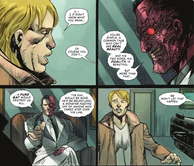 상황을 요약하자면어느 말단 깡패가 배트맨의 정체를 알아내고 그 정보를 투페이스한테 판매할려고 했는데투페이스 왈: 배트맨의 정체를 까발리면 그 놈은 24시간 배트맨으로 지낼텐데우리 중에 그거 감당 가능한 놈 없음. 넌 그 정보와 함께 죽어야됨.이라고 하면서 담가버릴려고 함.결론: 악당들도 24시간 배트맨은 감당하기 싫음