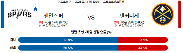 # 홈팀 : 샌안토니오(48승17패)샌안토니오는 직전경기(3/11) 홈에서 보스턴 상대로 125-116 승리를 기록했으며 이전경기(3/9) 홈에서 휴스턴 상대로 145-120 승리를 기록했다. 뉴욕 상대로 11연승이 중단되는 패배가 나왔지만 연패를 막고 다시금 5연속 승리를 추가했으며 리바운드 44-37, 3점슛 20-19, 턴오버 11-8의 결과. 빅터 웸반야마(39득점 11리바운드)가 공격과 리바운드에서 압도적인 활약을 펼치며 팀 승리를 이끌었던 경기. 디애런 폭스(25득점)가 백코트에서 득점을 보탰고 스테폰 캐슬(18득점)이 외곽에서 중요한 득점을 기록하는 가운데 경기 후반 보스턴이 추격했지만 캐슬의 결정적인 3점슛이 터지며 승부에 쐐기를 박았다. 정규시즌 홈경기에서는 9연승 흐름속에 25승6패 성적.# 원정팀 : 덴버(40승26패)덴버는 백투백 원정이다. 덴버는 직전경기(3/12) 홈에서 휴스턴 상대로 129-93 승리를 기록했으며 이전경기(3/10) 원정에서 오클라호마 상대로 126-129 패배를 기록했다. 2연패에서 벗어나는 승리가 나왔으며 리바운드 42-44, 3점슛 17-4, 턴오버 9-16의 결과. 니콜라 요키치(16득점 13어시스트 12리바운드)가 트리플더블을 기록했고 자말 머레이(30득점)가 팀 내 최다 득점으로 공격을 이끌었던 경기. 전반을 6점 차 리드로 마친 뒤 3쿼터에서 40-22로 크게 앞서며 점수 차를 벌렸으며 이 승리로 덴버는 올 시즌 휴스턴과 맞대결에서 3승1패로 우위를 확보했다. 정규시즌 원정경기에서는 22승13패 성적.# 상대전 특징가장 최근의 맞대결에서는 샌안토니오 스퍼스가 원정에서 139-136 승리를 기록했다.2연승+최근 5경기 4승1패 결과.# 부상자샌안토니오 스퍼스 : 빅터 웸반야마(C) 당일 결정, 해리슨 반스(PF) 당일 결정, 린디 워터스 3세(SF) 당일 결정, 데이비드 존스(SF) 시즌 아웃덴버 너게츠 : 페이튼 왓슨(SF) 3월17일 복귀 예정# 베팅추천샌안토니오는 최근 5연승을 이어가며 상승 흐름을 유지하고 있고 홈에서는 연승이 이어지며 안정적인 경기력을 보여주고 있다. 빅터 웸반야마가 득점과 리바운드에서 압도적인 존재감을 보여주며 팀 공격을 이끌고 있으며 디애런 폭스도 백코트에서 꾸준한 득점으로 공격 균형을 맞추고 있다. 또한 스테폰 캐슬이 외곽에서 중요한 득점을 보태며 공격 전개가 원활하게 이루어지고 있다. 특히, 홈에서는 높은 승률을 유지하며 경기 운영이 안정적인 모습이다. 반면, 덴버는 직전 경기에서 승리를 거두며 분위기를 끌어올렸지만 백투백 원정 일정으로 체력 부담이 있는 상황이다. 또한 최근 맞대결에서도 샌안토니오가 우세한 흐름을 보여주고 있다. 샌안토니오의 승리가 예상된다.◎ 가능성이 높은 선택 =>샌안토니오 승리◎ 을 노리는 선택 =>언더 # #국내배구 #국내농구 #MLB #NBA #UFC #스포츠분석 #E스포츠 #롤 #LAFC #경기분석2026-03-13 10:00 NBA 샌안토니오 스퍼스 vs 덴버 너겟츠 농구분석