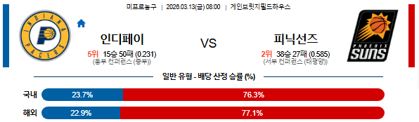 # 홈팀 : 인디애나(15승50패)인디애나는 직전경기(3/11) 원정에서 새크라멘토 상대로 109-114 패배를 기록했으며 이전경기(3/9) 원정에서 포틀랜드 상대로 111-131 패배를 기록했다. 10연패 흐름 속에 리바운드 48-52, 3점슛 13-7, 턴오버 15-11의 결과. 전반을 59-42로 앞서며 좋은 출발을 했지만 후반 들어 공격이 정체되며 역전을 허용했던 경기. 에런 네스미스(29득점)가 팀 공격을 이끌었고 오비 토핀(17득점 5리바운드)과 캠 존스(14득점 9어시스트)가 득점을 보탰지만 4쿼터(27-42)에서 데빈 카터의 연속 득점을 막지 못하며 경기 흐름을 내줬고 결국 했다. 또한, 이비차 주바치, 파스칼 시아캄, 앤드루 넴하드는 부상으로 결장한 공백이 컸다.정규시즌 홈경기에서는 6연패 흐름속에 10승22패 성적.# 원정팀 : 피닉스(38승27패)피닉스는 직전경기(3/11) 원정에서 밀워키 상대로 129-114 승리를 기록했으며 이전경기(3/9) 홈에서 샬럿 상대로 111-99 승리를 기록했다. 3연승 흐름 속에 리바운드 39-39, 3점슛 24-16, 턴오버 11-16의 결과. 리바운드 40-41, 3점슛 16-15, 턴오버 6-11의 결과. 딜런 브룩스가 왼손 골절로 결장했지만 데빈 부커(27득점)가 공격을 이끌었고 제일런 그린(25득점)과 로이스 오닐(21득점)이 20득점 이상을 기록한 경기. 양 팀이 15차례 동점과 12차례 리드 교환을 반복하는 접전이 이어졌지만 3쿼터 종료 직전 오닐이 약 15m 거리 버저비터 3점슛을 성공시키며 흐름을 가져왔던 상황. 이후 4쿼터 초반 7연속 득점을 올리며 점수 차를 벌렸고 경기 내내 최소 7점 차 리드를 유지하며 승리를 지켰다. 피닉스는 야투 성공률 53.9%와 함께 시즌 최다인 3점슛 24개를 기록했다. 정규시즌 원정경기에서는 2연승 흐름속에 16승14패 성적.# 상대전 특징가장 최근의 맞대결에서는 인디애나가 원정에서 98-133 패배를 기록했다.최근 5경기 3승2패 결과.# 부상자인디애나 페이서스 : 앤드루 넴하드(PG) 당일 결정, 퀜튼 잭슨(SG) 당일 결정, 애런 네스미스(SF) 당일 결정, 파스칼 시아캄(PF) 당일 결정, T.J. 맥코넬(PG) 당일 결정, 이비차 주바츠(C) 당일 결정, 조니 퍼피(SG) 시즌 아웃, 타이리스 할리버튼(PG) 시즌 아웃피닉스 선즈 : 조던 굿윈(SG) 당일 결정, 그레이슨 앨런(SG) 당일 결정, 마크 윌리엄스(C) 3월28일 복귀 예정, 딜런 브룩스(SF) 3월28일 복귀 예정# 베팅추천인디애나는 최근 10연패에 빠지며 경기 후반 집중력 저하와 전력 공백 문제가 동시에 나타나고 있다. 에런 네스미스와 오비 토핀이 공격에서 분전하고 있지만 파스칼 시아캄과 앤드루 넴하드 등 주요 자원의 결장으로 전력 균형이 크게 흔들리고 있고 홈에서도 연패 흐름이 이어지며 경기력이 안정되지 못한 모습이다. 특히 후반 공격이 정체되며 리드를 지키지 못하는 장면이 반복되고 있다. 반면, 다음날 원정에서 토론토를 만나는 일정을 위해서 힘을 분산해야 하는 피닉스는 최근 3연승을 기록하며 공격 흐름이 살아나고 있고 데빈 부커와 제일런 그린을 중심으로 득점력이 안정적인 모습이다. 또한, 외곽슛 성공률이 상승하며 공격 효율도 좋아지고 있다. 피닉스의 승리가 예상된다.◎ 가능성이 높은 선택 =>피닉스 승리◎ 을 노리는 선택 =>언더 # #국내배구 #국내농구 #MLB #NBA #UFC #스포츠분석 #E스포츠 #롤 #LAFC #경기분석