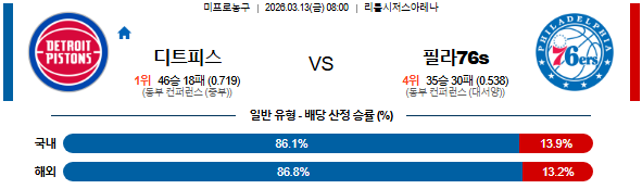 # 홈팀 : 디트로이트(46승18패)디트로이트는 직전경기(3/11) 원정에서 브루클린 상대로 138-100 승리를 기록했으며 백투백 원정이였던 이전경기(3/9) 원정에서 마이애미 상대로 110-121 패배를 기록했다. 4연패에서 벗어나는 승리가 나왔으며 리바운드 41-32, 3점슛 13-16, 턴오버 9-15의 결과. 기 초반부터 주도권을 잡으며 한 번도 리드를 내주지 않았던 경기. 제일런 듀렌(26득점)이 높은 야투 성공률로 골밑 득점을 책임졌고 케이드 커닝햄(21득점 15어시스트)이 경기 운영과 득점을 동시에 이끌었다. 또한 던컨 로빈슨(15득점)과 마커스 새서(14득점)가 외곽에서 득점을 보태며 공격 균형을 만드는 가운데 전반에만 73-40으로 크게 앞서며 경기 흐름을 완전히 장악했다. 정규시즌 홈경기에서는 24승8패 성적.# 원정팀 : 필라델피아(35승30패)필라델피아는 연속경기 일정이였던 직전경기(3/11) 홈에서 멤피스 상대로 139-129 승리를 기록했으며 이전경기(3/10) 원정에서 클리블랜드 상대로 101-115 패배를 기록했다. 2연패에서 벗어나는 승리가 나왔으며 리바운드 40-45, 3점슛 11-17, 범실 10-20의 결과. 경기 초반에는 끌려가는 흐름이었지만 4쿼터(41-25) 들어 반격에 성공한 경기. 캠 페인(32득점)이 4쿼터에만 13득점을 올리며 공격을 이끌었고 켈리 우브레 주니어(31득점 12리바운드)가 더블더블 활약으로 골밑과 외곽에서 득점을 책임졌다. 또한 퀜틴 그라임스(22득점)가 꾸준히 득점을 보탰고 부상에서 복귀한 루키 VJ 에지컴(21득점)도 공격에서 존재감을 보여줬다. 타이리스 맥시와 조엘 엠비드가 결장한 상황에서도 벤치 자원까지 고르게 활약하며 경기 막판 12연속 득점을 기록하는 등 흐름을 뒤집고 승리를 완성했다. 정규시즌 원정경기에서는 3연패 흐름속에 17승14패 성적.# 상대전 특징가장 최근의 맞대결에서는 디트로이트가 홈에서 114-105 승리를 기록했다.3연승+최근 5경기 4승1패 결과.# 부상자디트로이트 피스톤스 : 아우사르 톰슨(SF) 3월13일 복귀 예정, 카리스 르버트(SG) 당일 결정필라델피아 세븐티식서스 : 아뎀 보나(PF) 당일 결정, 켈리 우브레 주니어(SF) 3월28일 복귀 예정, 타이리스 맥시(PG) 4월1일 복귀 예정, 조엘 엠비드(C) 3월14일 복귀 예정, 조니 브룸(PF) 4월1일 복귀 예정, 폴 조지(SF) 3월25일 복귀 예정# 베팅추천다음날 홈에서 멤피스를 만나는 일정을 위해서 힘을 분산해야 하는 디트로이트는 직전 경기에서 대승을 거두며 최근 연패 흐름을 끊었고 홈에서는 안정적인 경기력을 이어가고 있다. 제일런 듀렌이 골밑에서 높은 야투 성공률로 득점을 책임지고 있으며 케이드 커닝햄이 경기 운영과 득점을 동시에 이끌며 공격 흐름을 안정시키고 있다. 또한 던컨 로빈슨과 마커스 새서가 외곽에서 득점을 보태며 공격 균형도 유지되고 있다. 특히, 홈에서는 높은 승률을 유지하며 경기 운영이 안정적인 모습이다. 반면, 필라델피아는 직전 경기에서 승리를 거두며 분위기를 끌어올렸지만 타이리스 맥시와 조엘 엠비드의 결장으로 전력 공백이 존재하고 원정에서도 연패 흐름이 이어지며 경기력이 다소 불안한 모습이다. 디트로이트의 승리가 예상된다. 다만, 핸디캡 범위는 과하다.◎ 가능성이 높은 선택 =>디트로이트 승리◎ 을 노리는 선택 =>핸디캡 필라델피아 승리 # #국내배구 #국내농구 #MLB #NBA #UFC #스포츠분석 #E스포츠 #롤 #LAFC #경기분석2026-03-13 08:00 NBA 디트로이트 피스톤스 vs 필라델피아 76ERS 농구분석